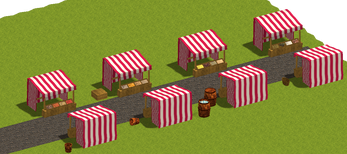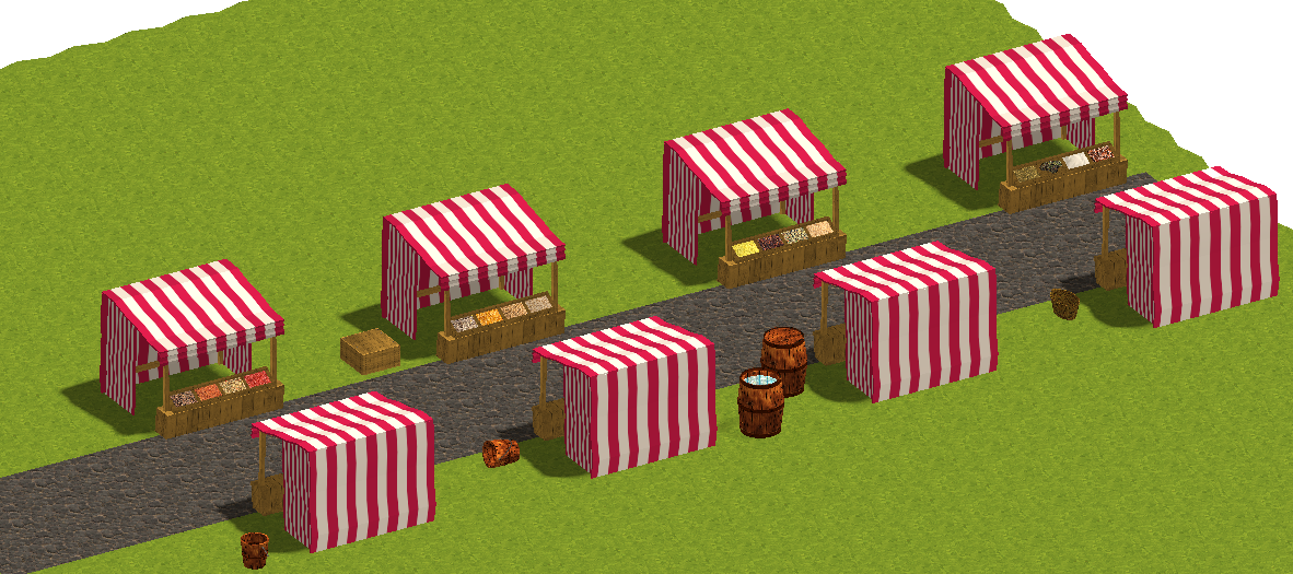 The Modular Market Pack Vol. 1 (newly reworked and retextured) contains 85 models for use in SMILE GAME BUILDER, including animated water for barrels and boxes. All models are designed modularly to fit snugly together and provide variety to your markets.